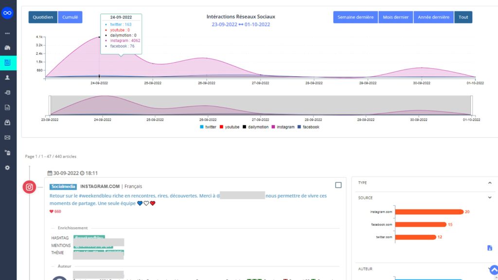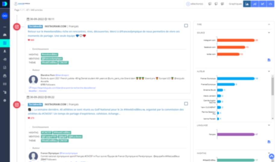Notre interface classe pour vous les informations par date et heure, par thématique, par audience et engagement… Les statistiques correspondantes (sous forme de tableaux ou autres infographies) vous permettent de mesurez les évolutions dans le temps.