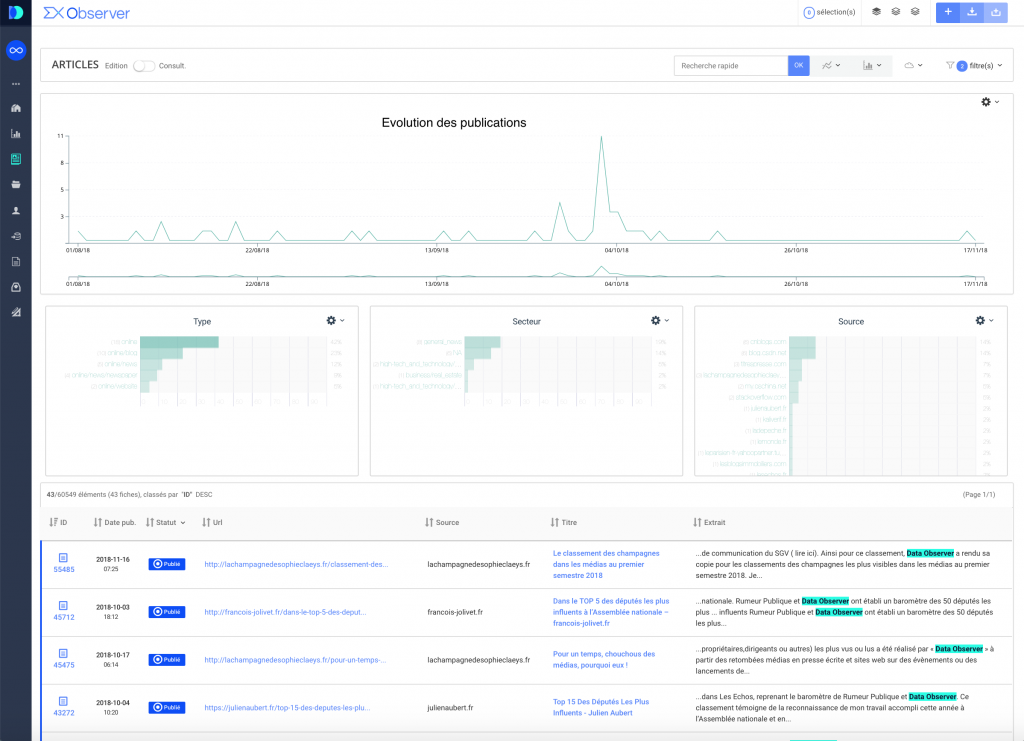 Au-delà de la collecte des données et de leur analyse, nous vous proposons de vous délivrer l’information sous le format de votre choix : alerte, détection d’opportunités de prise de parole, mesure de vos actions, analyse des tendances…